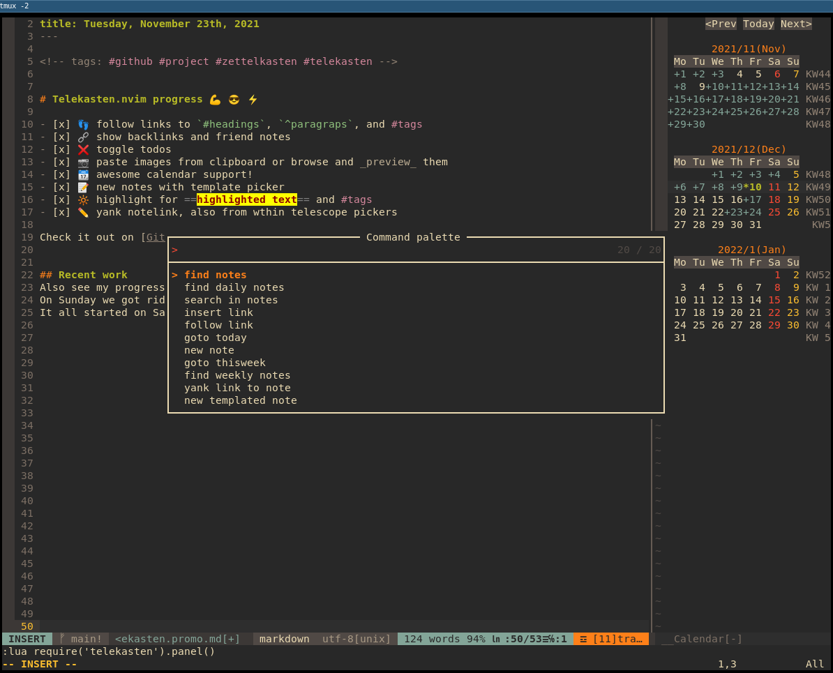 After having written the infamous sublime_zk for SublimeText, having moved on to my standalone sublimeless_zk, having tried Roam Research and Obsidian.md (which I still use sparingly), I have eventually arrived back at the editor I feel at home the most: Neovim 😄! I can literally live inside of nvim now, not only for writing code.